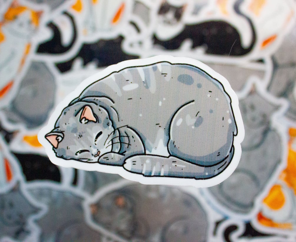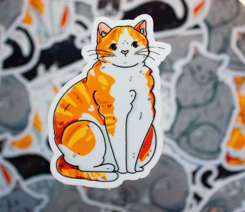 Hand-made, water resistant stickers of a sitting orange tabby cat (Aprox. 2" x 3"), a laying tuxedo cat (Aprox. 3" x 2"), a sleeping grey tabby cat (Aprox. 3" x 2") and a sitting grey cat (Aprox. 2" x 3"). All printed on vinyl sticker paper with clear laminating.